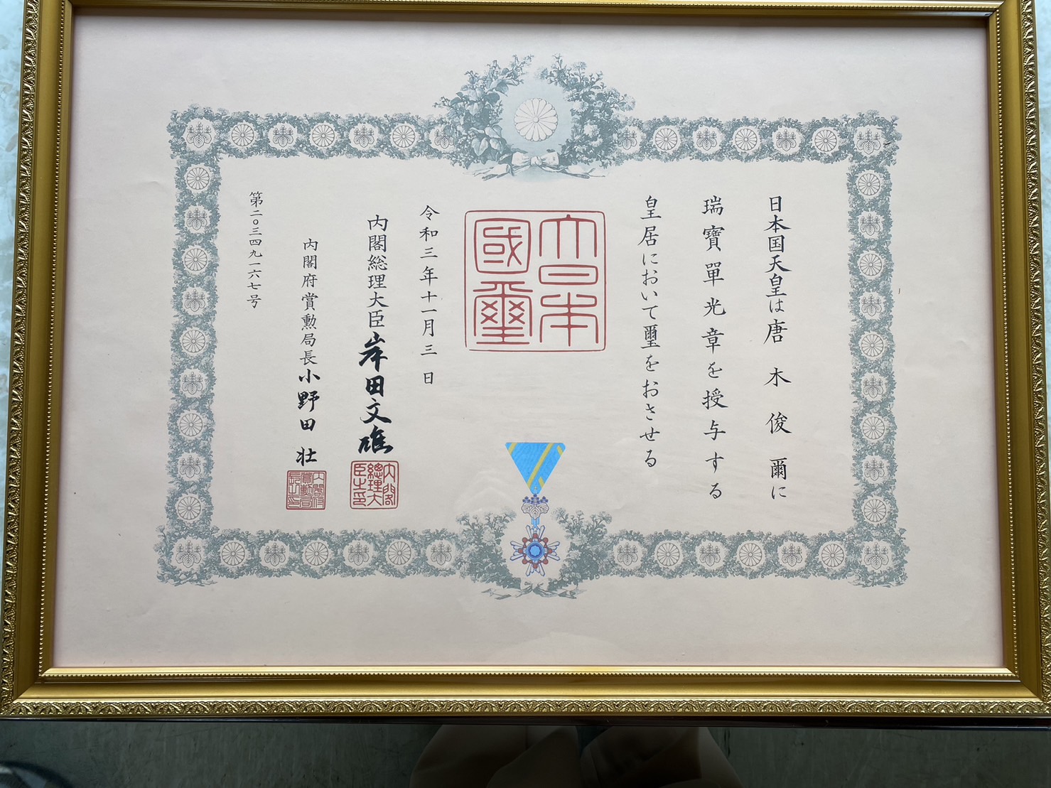 令和3年11月3日、弊社に勤務する 唐木 俊爾 が瑞寳單光章を受章いたしました。