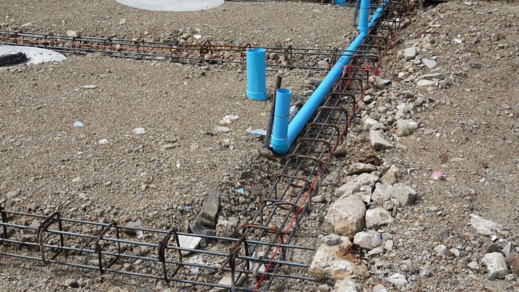 遣り方まで終わったら、水道工事(配管工事)を行います。敷地の外から建物の中への配管工事を行います。外回りと床下の給排水管を施工します。