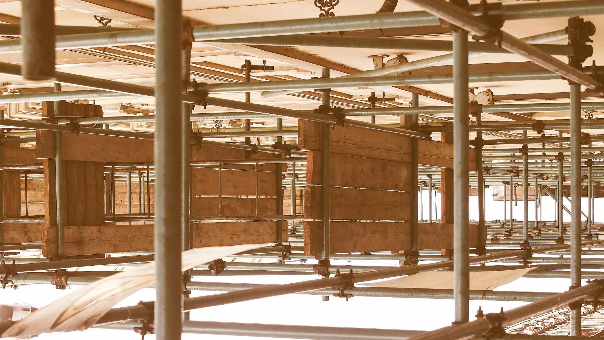 高所での作業の為に、足場を設置いたします。足場の設置が終わったら、家の外枠、内側の仕切りを立てるための木造設置を行います。